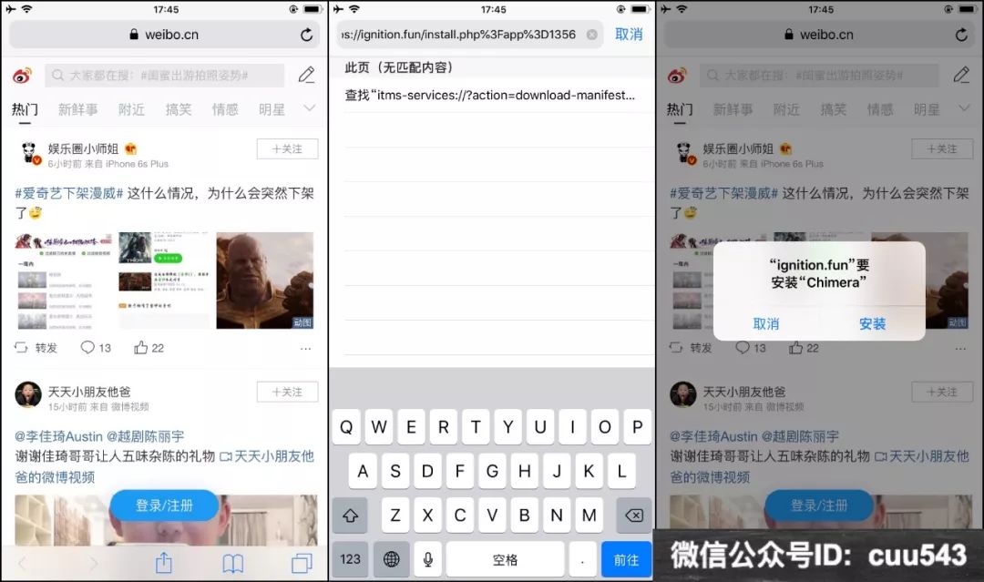 接着打开 Safari浏览器,然后先随便打开一个网站(如微博),再到浏览器地址栏 粘贴刚刚复制的这段代码并跳转,点击 打开 - 安装
