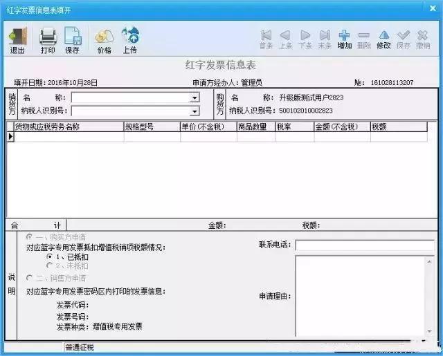 2.进入申请单填开界面,并根据实际情况填写内容,最后打印《红字发票申请单》(一式两联)