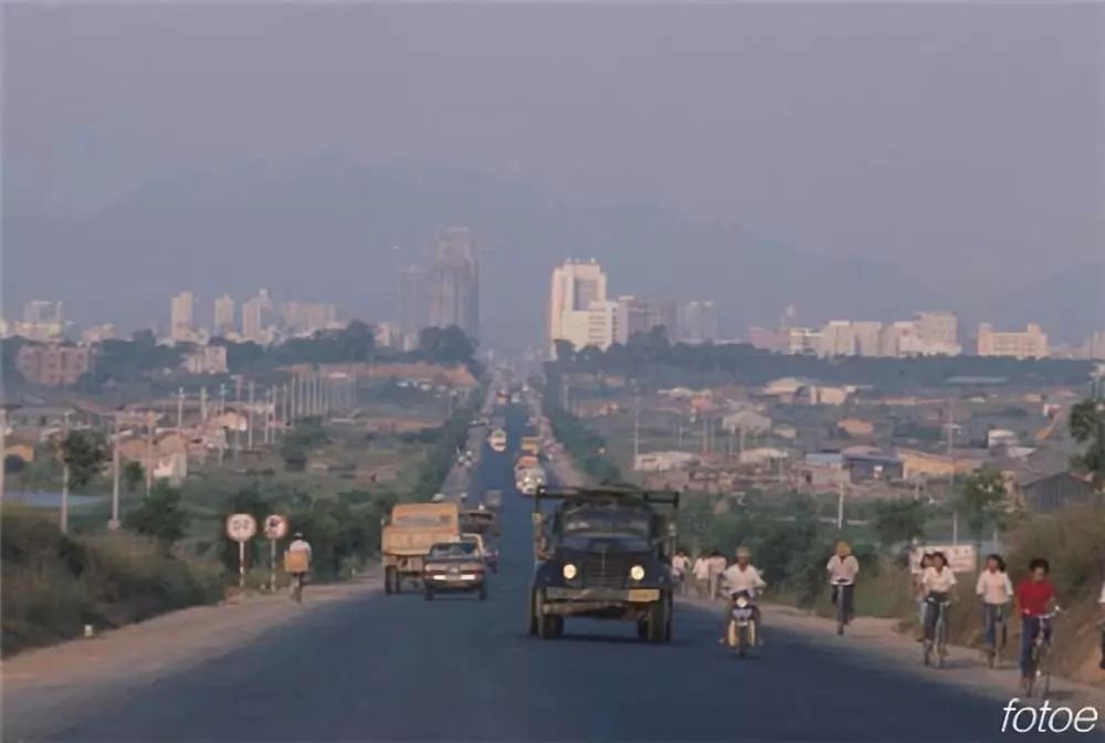 1985 年,深圳的深南大道仍然是一条狭窄的柏油路,路上车辆稀少。