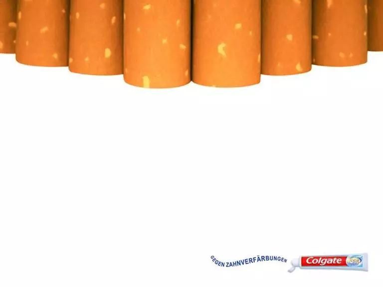 设计师并没有展示出,白色的高露洁是如何使牙齿变白,而是把问题本身作为解决问题的方法。广告中,用使牙齿变黑变黄的物质代替牙齿,这些物质有香烟、咖啡豆和茶包这样的牙齿染色物质,可想而知,这则广告会以一种完全不同的方式吸引你的注意力。
