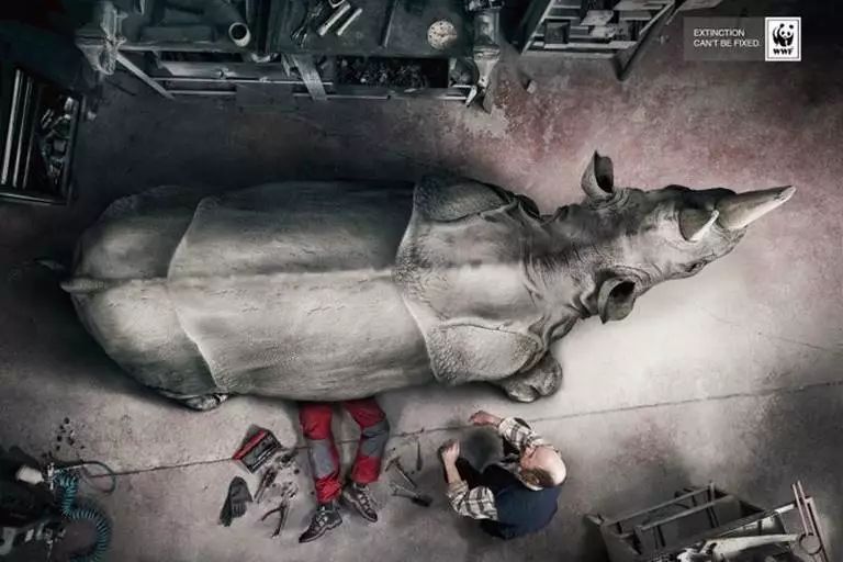 将已经灭绝的动物置于汽车修理厂的车库中,同时与世界野生动物基金会的广告信息——“灭绝是无法修复的” 相切合。鸟瞰图增加了一个独特的视角。