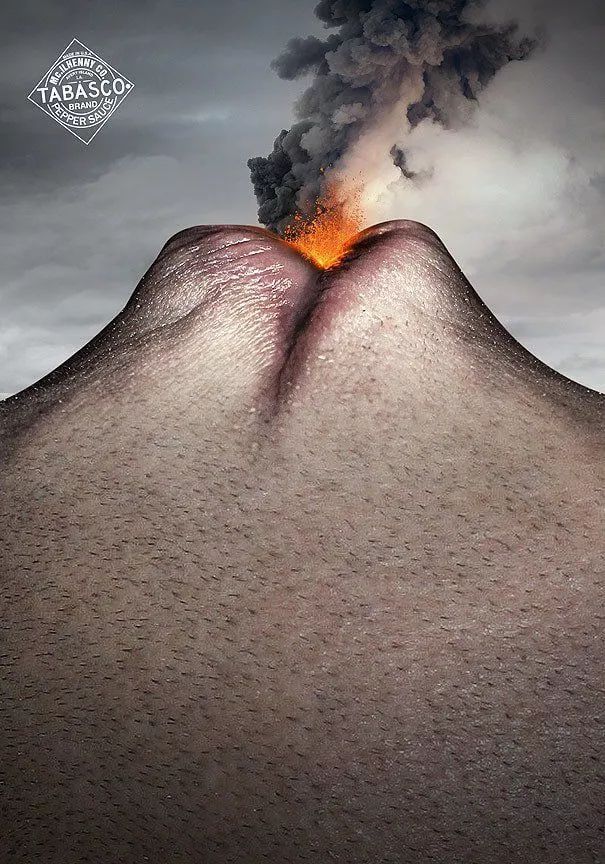这幅创造出的图像,传达辣味塔巴斯科酱的关键要素——辣味本身。广告画面是从人脸上大胆制作的火山形象,这是个一个很好的创意。