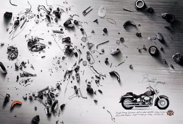 Harley Davidson的配件和配饰,展示了由拆解摩托车零部件创作的自行车车主肖像。