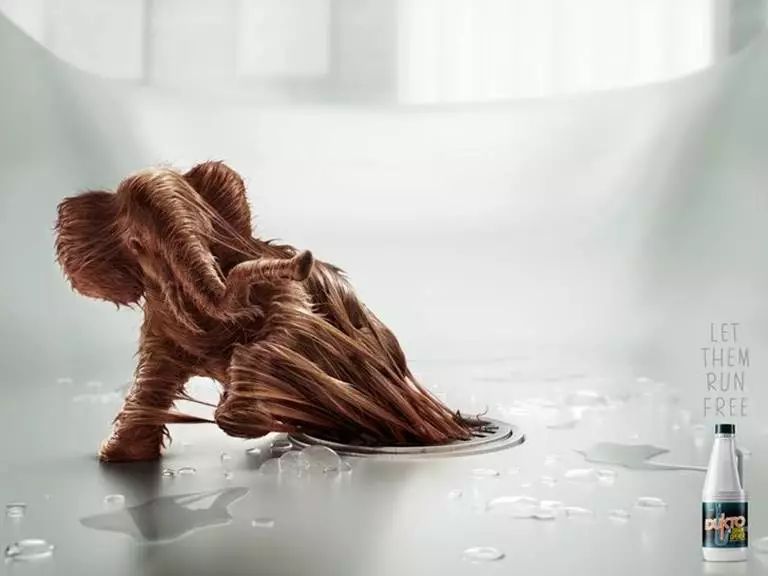 在杜克托排水器的“让他们自由奔跑”广告中,把产品功能性与头发结合出被困动物的图像。
