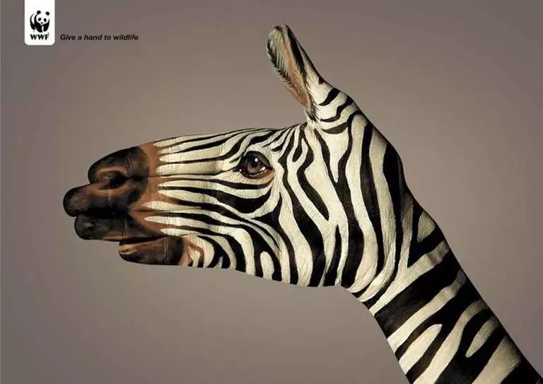 世界野生动物联合会的“为野生动物提供帮助”的活动,广告画面是画在一只人手上的引人注目的、斑马头的图像。