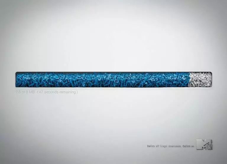 在音乐爱好者和音乐家制作的在线下载栏中的广告语——“关闭非法下载,开启MTV”,以表明粉丝在窃取音乐时,实际上伤害了他们的音乐偶像。对细节进行创意,可以激发出一种本身并不令人感兴趣的形象。