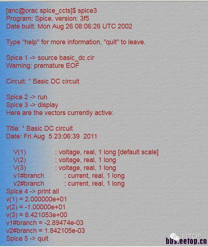 同样,你可以用下面的链接下载Quarles的论文http://www.eecs.berkeley.edu/Pubs/TechRpts/1989/ERL-89-46.pdf下面是SPICE3(版本3f5)的执行语句,注意它是交互式的。每一个“Spice<number>->”后面是一个Spice3的命令。比如“source”就是把电路读入,“run”就是运行,”display”就是显示,”quit”就是退出。