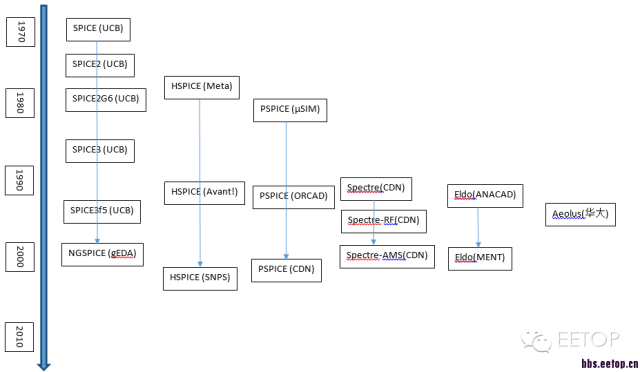 下面的图给出了主要SPICE的发展过程。其中的代号如下:UCB:伯克利,gEDA:GNU EDA,Meta:Meta-Software,SNPS:Synopsys,µSIM:MicroSIM,CDN:Cadence,MENT:Mentor
