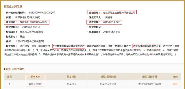 就在宣布接管包商银行的当天,央行就成立了存款保险基金管理有限责任公司,注册资本100亿。(可以在国家企业信用信息公示系统查看)