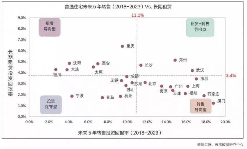 云房数据研究中心,结合25城市普通住宅的未来转售及长期租赁回报率,勾勒出普通住宅房地产投资价值导向图,通过图表划重点,我们可以窥见出普通住宅市场投资4宗“最”,具体为:
