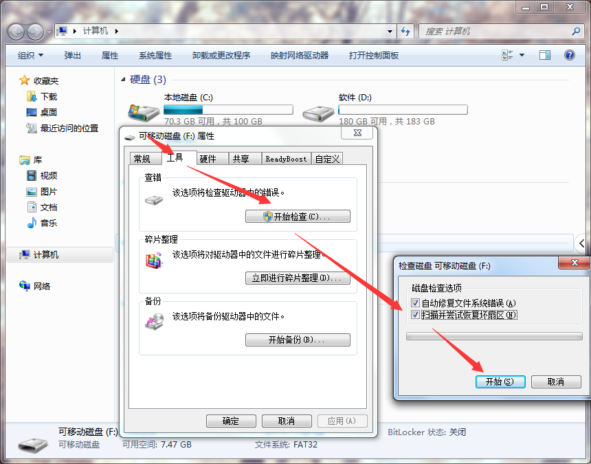 步骤二:之后选择【工具】选项,点击【开始检查】按钮,之后弹出检查磁盘选项,将下述两种选项勾选上,然后点击【开始】按钮,这时程序就开始修复SD卡了,修复成功后会提醒。