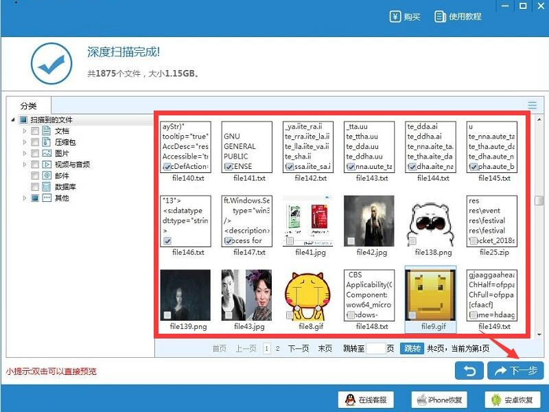 步骤四:扫描结束之后,在界面左侧找到丢失数据丢应的格式点击,右侧就显示有具体的文件信息了,在其中找到需要恢复的文件勾选上,之后点击【下一步】按钮。