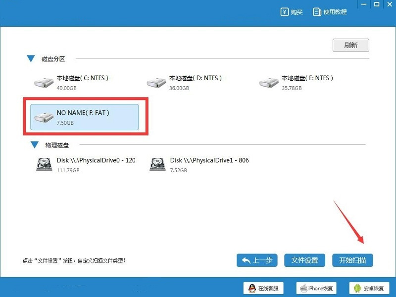 步骤三:界面上显示有读取的SD卡以及电脑的分区信息了,在界面勾选中SD卡分区后点击【开始扫描】按钮,软件就开始了对SD卡的数据扫描工作了,扫描时间取决于SD卡中数据的多少,耐心等待扫描完成即可。