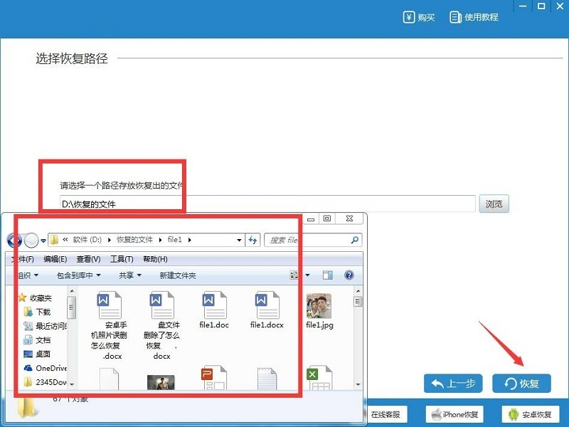 步骤五:点击【浏览】按钮选择恢复后文件的存储位置后,点击【恢复】按钮来进行丢失数据的恢复工作,恢复结束后弹出提示框,点击【确定】按钮即可查看到恢复后的文件了。之后可以进行数据的转移和备份等的操作。