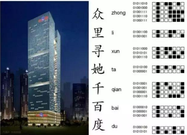 百度总部也是位于深圳,外观上和腾讯的有些相似,也是有两栋高楼组成,百度大楼最大的特点就在在观设计上采用了“二进制代码”的方式,将“众里寻他千百度”这句诗词展现在了百度大楼上,非常有创意!