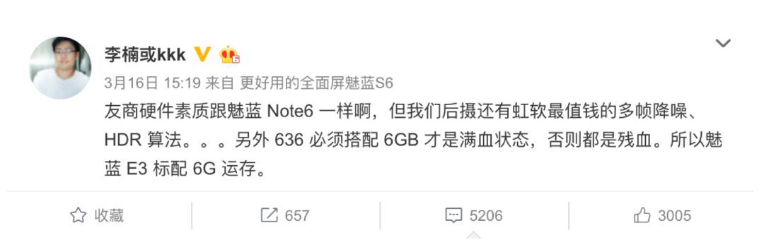 这个看上去很伪命题的问题源自于前段时间红米Note5发布后,魅族高级副总裁李楠发出的一个微博。在微博中,李楠写道: