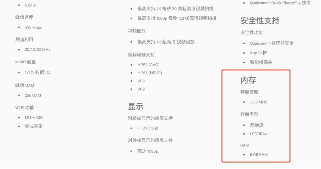 回到内存的话题,骁龙636有没有只有配备6GB内存才能保证满血一说呢?实际上,在官方给出的配置列表中清楚地写到:骁龙636最高支持8GB LPDDR4x 1333MHZ。如果按照上述理论,6GB的RAM还是不能“喂饱”骁龙636,依然只是“残血”。