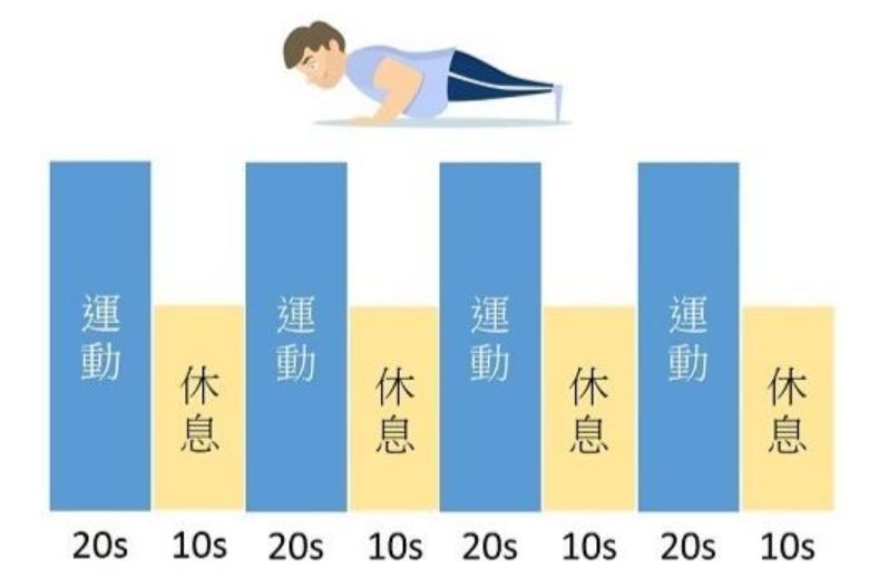 高强度间歇训练(HIIT)是结合短时间高强度的爆发性运动,在一个15-20分钟短时间的训练中,重复训练与休息的时间。基本上它需要较小的运动时间,通常都是1分钟,再搭配3-5分钟的休息时间。另外,它的最大心率为85-100%之间,而不是中等耐力活动的50-70%。高强度训练就是强度较高且具有爆发力的运动。通过高强度的运动,让身体中的肌肉感受到疲劳,进而开始大量消耗氧气。 此时,高运动强度让身体耗氧量达到最大摄氧量(身体在运动时可以消耗的氧气量最大值)时,会启动一种机制叫做「后燃效应 After-burn Effect」, 简单来说,就是可以让身体在停止运动之后,还继续消耗氧气,因此也能持续消耗热量。