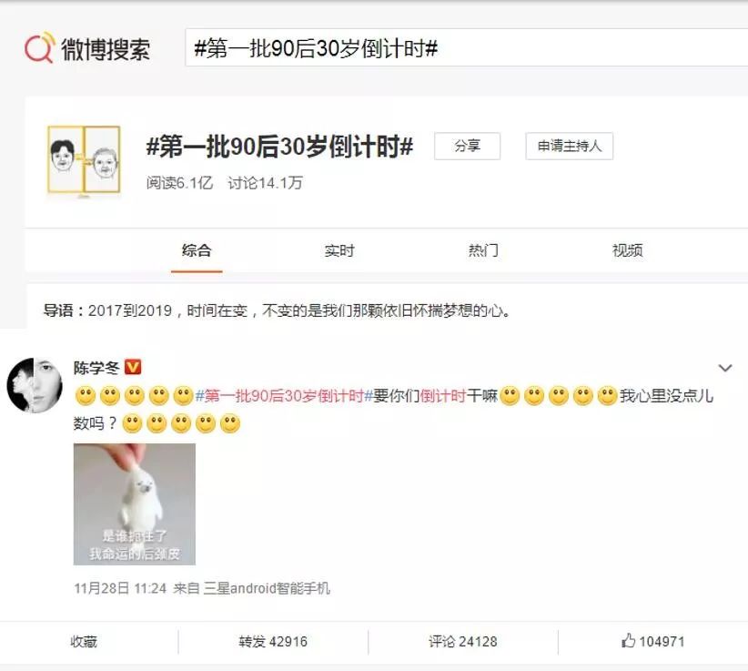 近几天,#第一批90后30岁倒计时#的话题冲上了热搜榜,截止目前话题阅读数达到6.1亿,参与讨论14.1万人,甚至连官媒如人民日报、人民网等,明星陈学冬都在安利这个话题,足见这个话题的关注度和热度有多高。