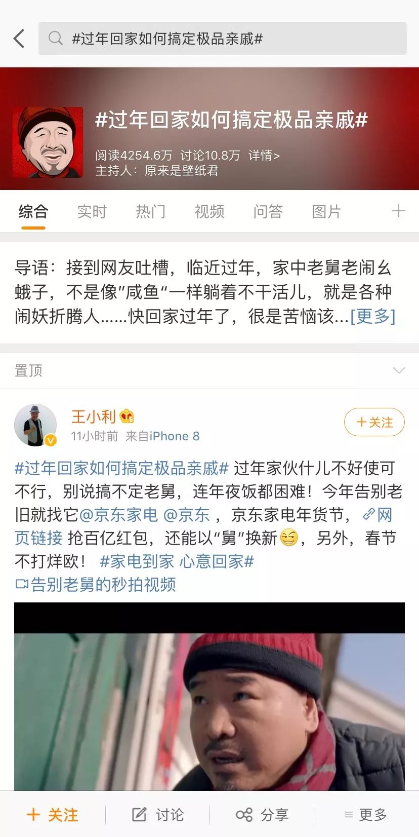 首先,京东家电在微博发起#过年回家如何搞定极品亲戚#的话题引发粉丝们热烈的讨论。京东和京东家电官微在1月5日发布《告别老舅》悬念视频,引发网友的好奇;1月6日正式发布《告别老舅》并联合了多个娱乐、段子、社会新闻类微博大号进行集中爆光。