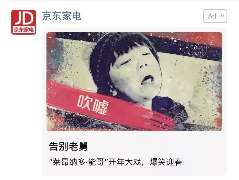另外,京东家电还在朋友圈投放病毒视频《告别老舅》,在用户时间碎片化的场景下,通过微信平台抢占用户的注意力,从而进一步传递京东家电年货节的信息。