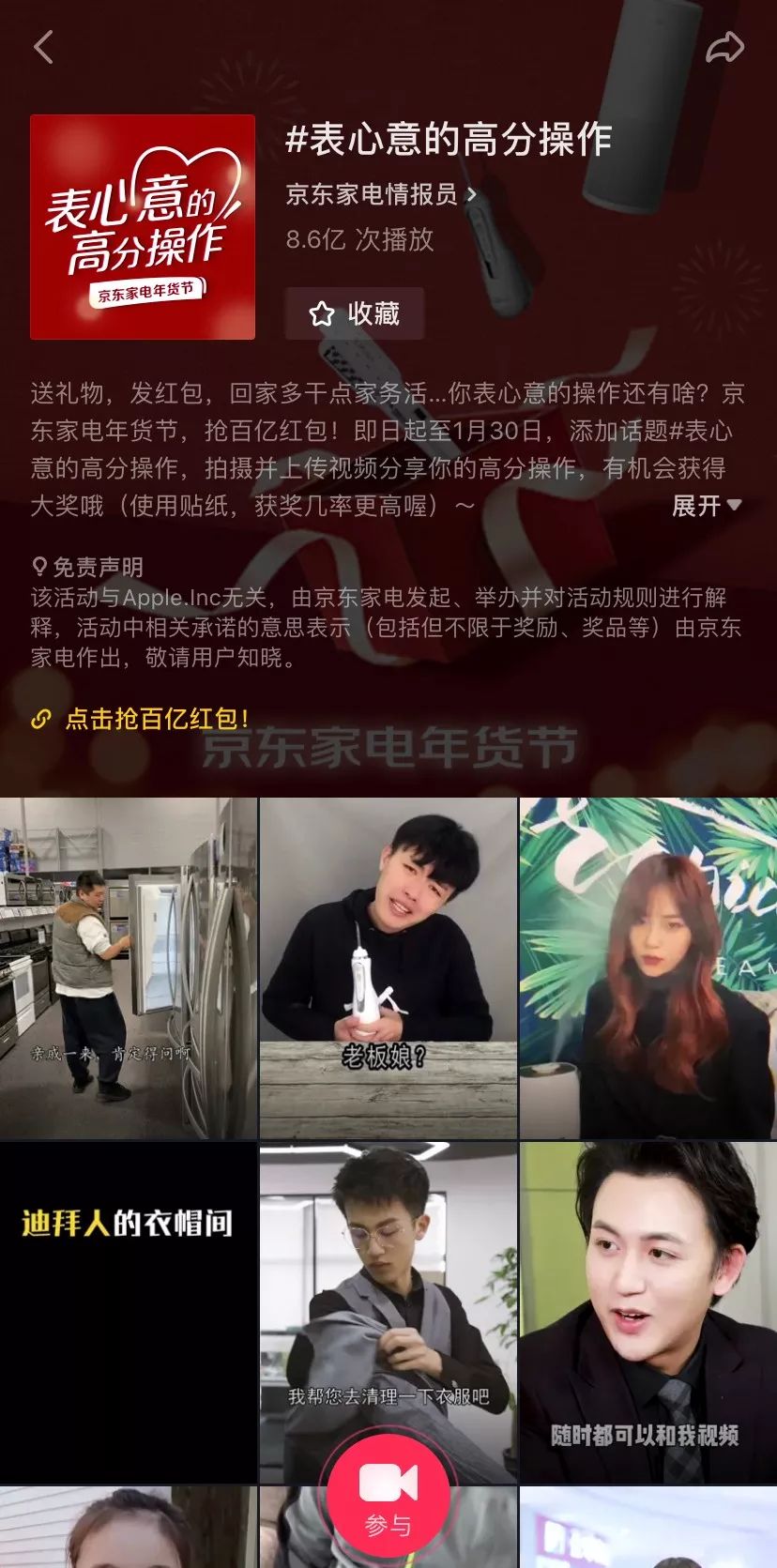其次,深知消费升级背景下的消费者,已经从被动接受品牌传播转变为了主动参与,京东家电节在抖音发起#表心意的高分操作#的挑战赛,先由达人拍摄创意视频吸引粉丝们大量的参与视频创作,产生了很多优质UGC内容形成二次传播。