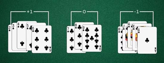 将 2~6 记作1,7~9 记作 0,10~A 记作 -1,通过简单的加减法快速记住场上牌的变化。