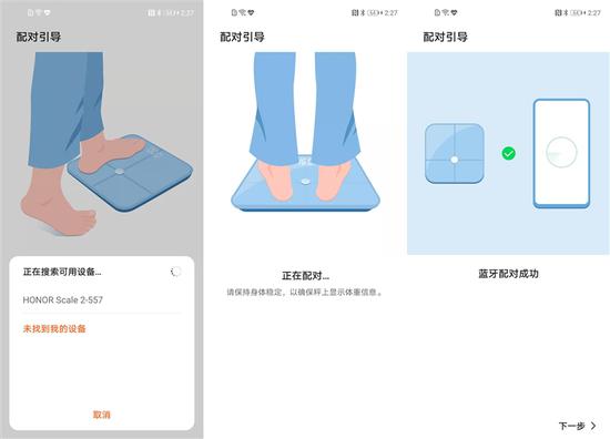 配对引导非常直观易懂,只需保持站在体脂秤上,选择荣耀智能体脂秤2的蓝牙就可以顺利配对。