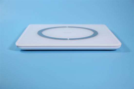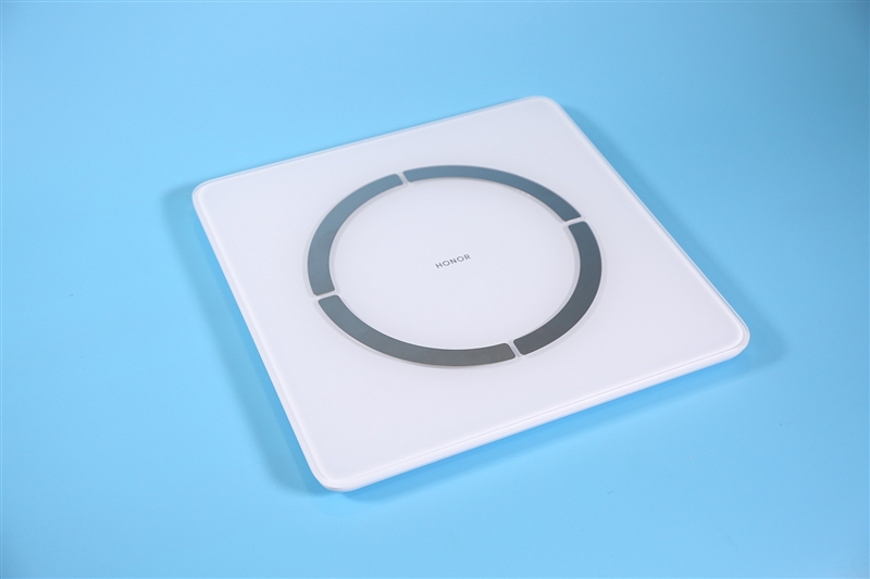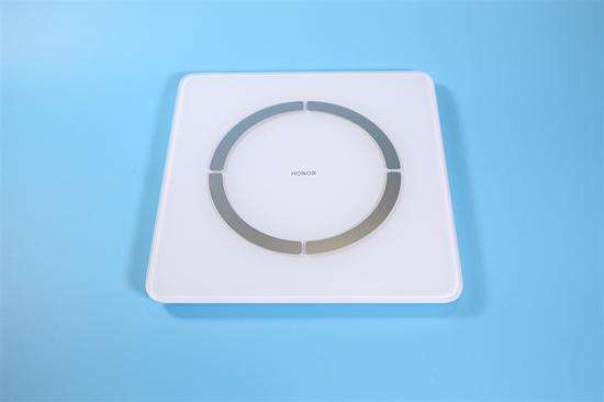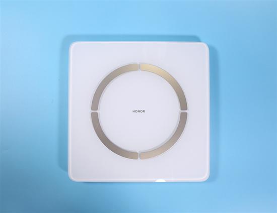 顶部采用钢化玻璃面板,底座则采用了ABS工程塑料设计,坚固的同时依然轻薄。所以荣耀智能体脂秤2的重量只有1.23 kg(不含电池),厚度也控制在了21.5mm。