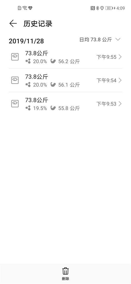 荣耀智能体脂秤2可以追踪一个指标的长期变化趋势,笔者一晚的三次测量都被记录了下来。有长期减肥健身需求的人通过这个功能,可以系统性的看到每周、每月、每年的人体指标变化情况,非常方便评估自己的锻炼效果。