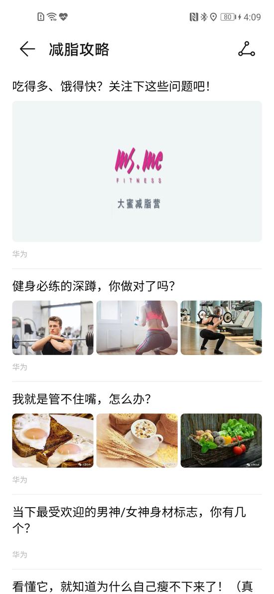 华为运动健康APP中也提供了许多减脂攻略。像笔者经过这次体脂测量之后就意识到了自己需要进行一些减脂训练。通过这个APP可以看到许多减脂教程,马上就可以开始锻炼。