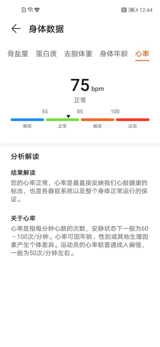 当我们看到心率数值显示出来时,标志着整个身体指标测量已经结束,可以看到笔者的静息心率为75,属于正常范围。