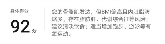对于我们一般人来说,很难理解这些数值的具体含义。还好华为运动健康APP给予了每一项人体指标一个评级,并且有综合的身体得分,全方位帮助你了解自身的身体状况。像笔者就得到了92分的身体得分,华为运动健康APP提供的评价与建议是骨骼肌发达,但是存在脂肪肝等风险,要注意清淡饮食和健身。打开任意一项人体指标,都会显示详细的评测标准、指标含义,以及对我们测量结果的评价和建议,非常有参考价值。我们这次主要查看新增加的三项人体指标。
