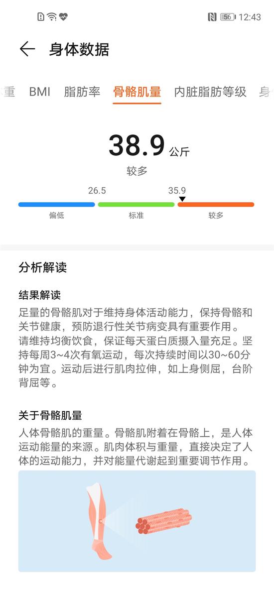 骨骼肌量,代表了你身体活动能力是否健康。足够的骨骼肌量可以保持骨骼和关节的健康。笔者的骨骼肌量为38.9公斤,评级为较多,要继续保持均衡健康的饮食,预防关节病变等疾病发生。