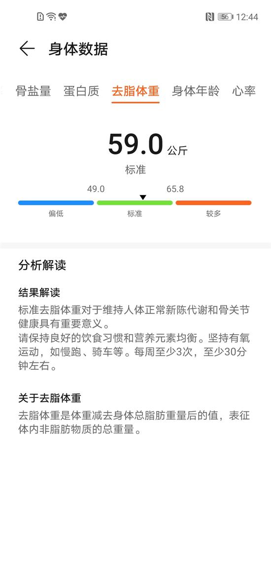 去脂体重为人体去除总脂肪重量后的体重值,它代表了人体内肌肉、血液这些非脂肪物质的重量水平,对于人体新陈代谢的健康有很重要的参考意义。笔者的去脂体重为59公斤,属于标准范畴。如果多加锻炼,提高去脂体重,也就意味增长了肌肉,提高了基础代谢量,对于维持健康的体型十分有用。