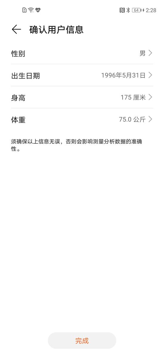 第一次配对后,需要输入身高、年龄、性别、体重的基本信息,来获得你的基础身体情况。