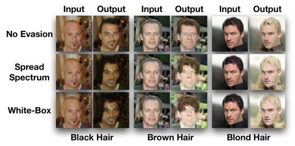 在灰盒测试的设置中,干扰者不知道用于预处理的模糊类型和大小,因此模糊是一种有效抵御对抗性破坏的方式。低幅度的模糊可以使得破坏失效,但同时可以保证图像转换输出的质量。下图 5 展示了在 StarGAN 结构中的示例。