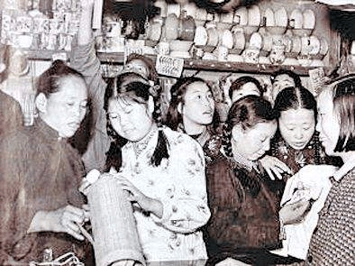 供给短缺的时代里,人们常常由于抢购商品而挤碎玻璃柜台。