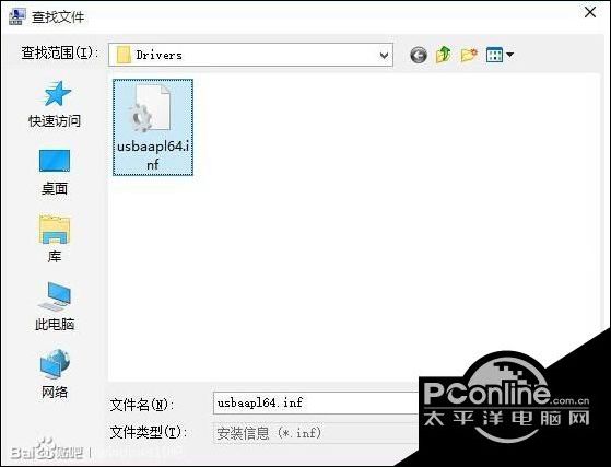 6、浏览到文件夹:C:\Program Files\Common Files\Apple\Mobile Device Support\Drivers 文件夹下,找到usbaapl.inf文件,之后选择“打开”,然后确定安装就可以了。(如果是64位的itunes,所以这里的文件是usbaapl64.inf 如果是32位的,那么就是usbaapl.inf)