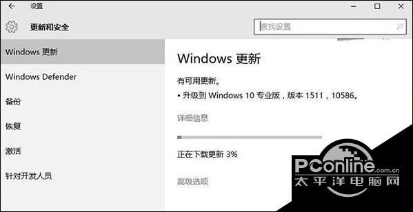 2、系统会自动搜索更新,当看到“升级到Windows 10专业版,版本1511,10586”时,表明当前系统准备好接收并安装新版本,如下图所示: