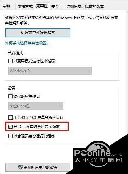 2、勾选“高DPI设置时禁用显示缩放”选项;