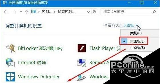 2、将控制面板“查看方式”修改为“大图标”,在下面点击“Windwos 防火墙”;