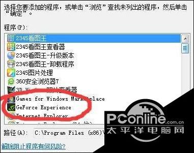 5、在程序框中选中“GeForce Experience”,然后点击“添加”;