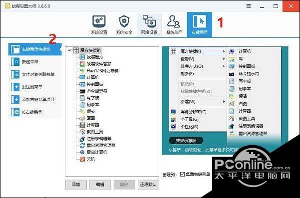 2、然后切换到顶部右侧的“右键菜单”设置,然后点击左侧第一项的“右键菜单快捷组”,这里可以按需自定义右键菜单,包括计算器功能,完成后,点击右下角的“生成菜单”,这样就可以将计算器功能加入桌面右键菜单中,如图。