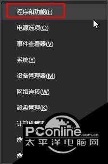 1、按下“Win+X”组合键打开快捷菜单,点击“程序和功能”选项;