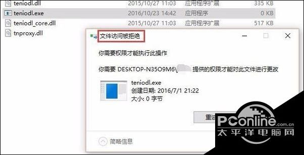 8、运行这个命令之后teniodl.exe文件也就无法删除了,如图所示没有任何权限删除文件。要撤销的话就运行: cacls "路径" /G everyone:F ,允许所有人操作该文件。