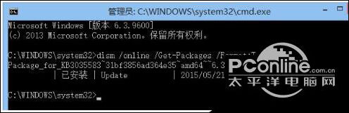2、在命令提示符框中输入:dism /online /Get-Packages /Format:Table|findstr 3035583 按下回车键,查看是否有信息提示,若没有信息提示,则说明系统中未安装“KB 3035583”补丁;(未安装该补丁的用户依次打开“控制面板”—“系统和安全”—“Windows ”更新“中检查并安装,安装后重新启动计算机)