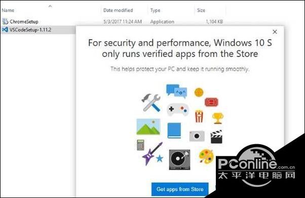 那么可能你会问,当尝试安装Windows Store 商店之外的应用时会如何,目前早期的体验表明,Windows 10 S 系统会弹出提示框“在Windows 10 S 上使用的应用必须来自Windows 应用商店”,再一次告诉用户只能使用Windows 商店的应用。在某些情况下,系统还会自动跳转显示关于已在Windows 应用商店中提供的某类相似应用,或者某种特定应用的建议。
