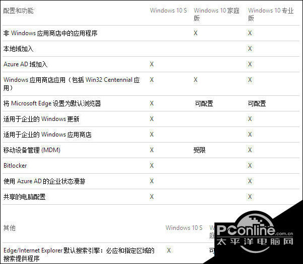 Windows 10 S 与其他版本的差异也是很多人所关心的问题。从上面对Windows 10 S 的定义,可以确认该版本系统仍具备Windows 10 Pro 多种功能特性,但唯一不同的是安全性和性能。