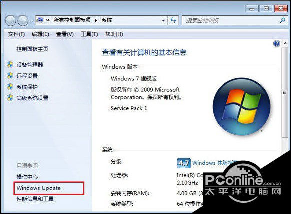 2、在打开的系统界面,点击左下角的WindowsUpdate进入系统更新设置,如下图所示。